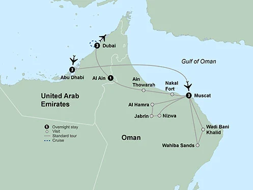 From immeasurable opulence to ancient cultures, uncover the treasures of the fascinating countries of the United Arab Emirates and Oman. In Abu Dhabi, explore the sprawling Sheikh Zayed Bin Sultan Al Nahyan Mosque, a symbol of the diversity in the Islamic world. At the largest falcon hospital in UAE, explore its museum to learn the falcon’s importance to Arabian culture, and then step into the examination room! Venture to the breathtaking desert dunes of Wahiba Sand in Oman and visit with a local tribe. Take a camel ride followed by an exhilarating “dune bashing” by 4×4. In Dubai, set sail in a private family-owned luxury yacht. Enjoy a Dune Desert Safari on an Arabian farm. Savor a barbeque dinner highlighted by a belly dancing performance. Discover the Sheikh Mohammed Center for Cultural Understanding and partake in a lecture on the traditions, customs and religion with a local expert. As you travel through the Arabian Peninsula, you’ll uncover the allures of this unfamiliar world and come to know the kind spirit of its people.