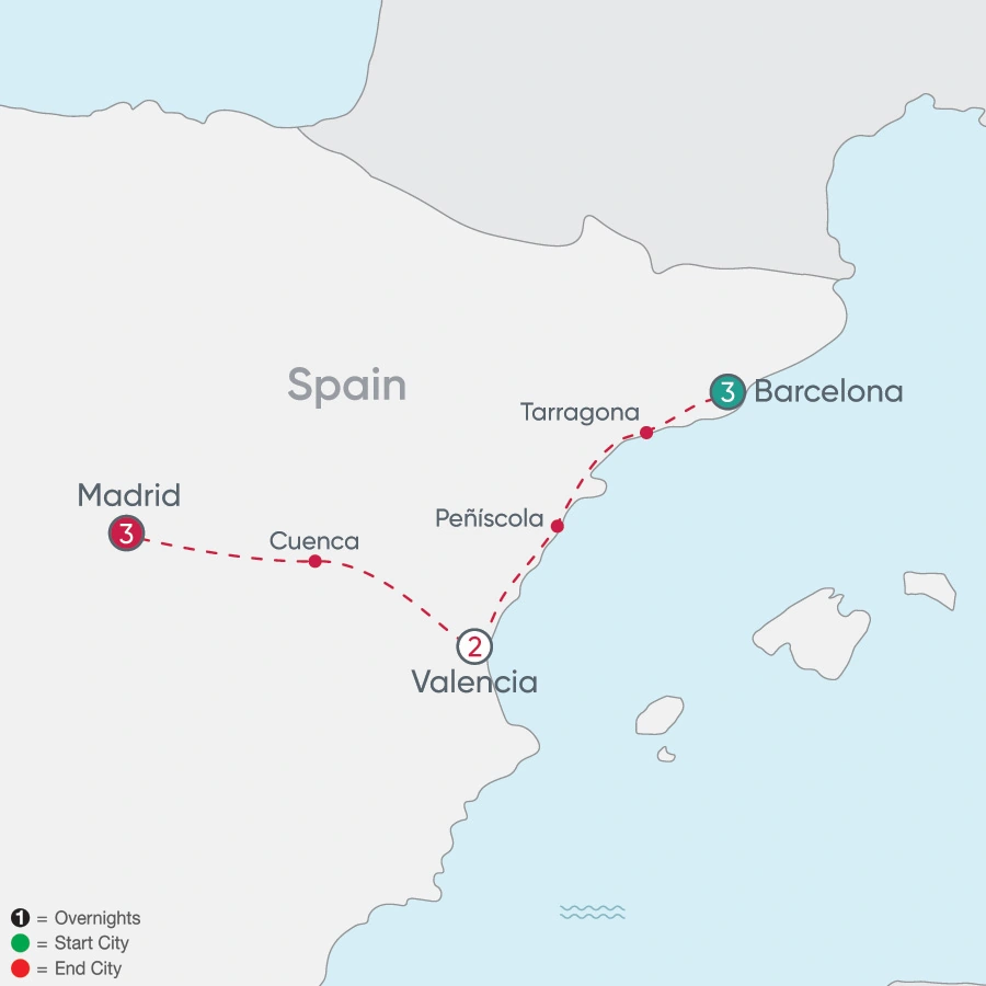 Barcelona, Valencia, and Madrid are spectacular Spanish cities: Barcelona, home of great artists Gaudi, Picasso, and Miro; Valencia with its contemporary architecture matched only by its fantastic food, fun, and beach life; and Madrid, the elegant city of sophistication and lively atmosphere. Begin your escorted vacation in Spain with three nights in Barcelona with your days free to discover and enjoy. Cosmos Lite gives you à la carte options to spend your vacation the way you want. Maybe select an optional tapas walking tour or a wine tasting to sample Spanish fare and vintages. Your Tour Director is on hand to point you in the direction of the best sights, food, and attractions. On your way to Valencia, you’ll see the Peñíscola coastline and castle—a filming location for Game of Thrones. Continue on while admiring the magnificent views of the Mediterranean Sea, to visit Valencia and Madrid. Lovers of art, food, and colorful history are sure to find lots to discover—with optional excursions in the heart of Spain’s most fascinating locales. Your guided tour of Spain is yours to shape each day with Cosmos Lite optional excursions. With MyCosmos, you’ll find the perfect way to experience Spain’s legendary cities just the way you like—from museums and markets to cathedrals, coastlines, and fantastic Spanish cuisine. Explore the treasures of España your way, every day!