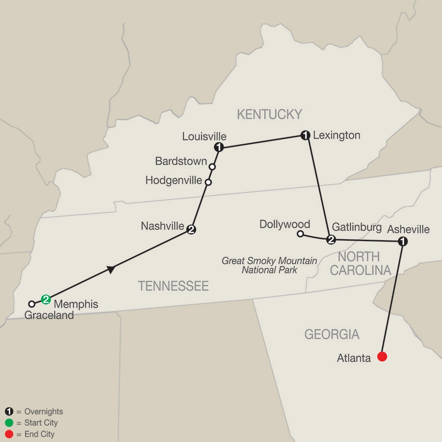 MEMPHIS Sightseeing tour; visit Graceland and the Rock ‘n’ Soul MuseumNASHVILLE Sightseeing tour with a Local Guide; visit Country Music Hall of Fame; [LF] visit RCA Studio B and record your own hit; reserved seats at Grand Ole Opry show; [LF] backstage tour of the Grand Ole Opry HODGENVILLE Abraham Lincoln’s birthplaceBARDSTOWN Visit My Old Kentucky Home State Park and Heaven Hill Whiskey DistilleryLOUISVILLE [LF] Experience the “backstretch” area at Churchill Downs; visit Kentucky Derby MuseumLEXINGTON[LF] Behind-the-scenes Kentucky Horse Farm visitGATLINBURG Orientation tour DOLLYWOOD Explore the parkGREAT SMOKY MOUNTAIN NATIONAL PARK Orientation tourASHEVILLE Tour Biltmore Estate; farewell dinner