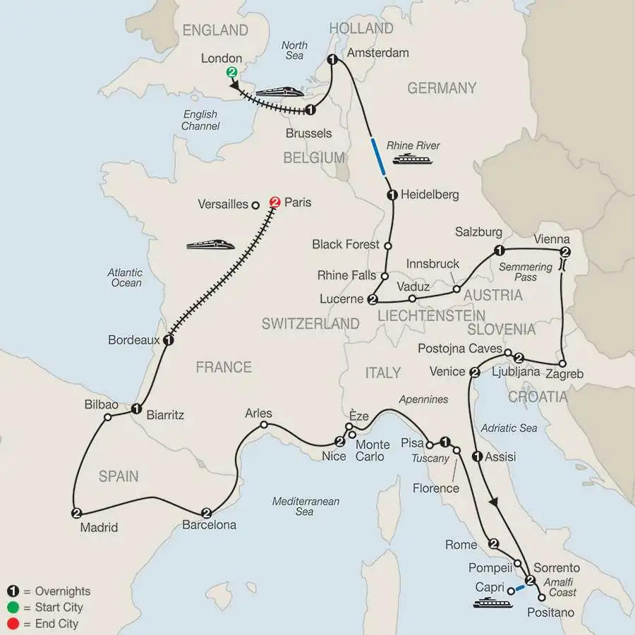 LONDONGuided sightseeing, visit St. Paul’s CathedralLONDON–BRUSSELS By high-speed Eurostar trainBRUSSELS Visit Grand’Place; [LF] enjoy a waffle and beer tasting at a local café; welcome dinnerAMSTERDAM Canal cruise; diamond centerRHINE CRUISEHEIDELBERGTake pictures of the castleBLACK FOREST Hear about the art of woodcarvingRHINE FALLSLUCERNEWalking tour including the Lion Monument and Chapel BridgeVADUZ Visit the capital of LiechtensteinINNSBRUCK Walk to the Golden Roof SALZBURG[LF] A special dinner at Farmhouse Lenzenbauer; guided walking tour, visit Mirabell Gardens and Residenz Square VIENNAGuided sightseeing, visit Heldenplatz and Cathedral Square; admire the unusual HundertwasserhausZAGREBGuided sightseeing; visit the cathedralLJUBLJANAGuided sightseeing, visit St. Nicholas’ Cathedral POSTOJNA[LF] Visit the Postojna Caves by mini-trainVENICEPrivate boat ride; guided walking tour, visit St. Mark’s Square & Basilica, Doges’ Palace and the Bridge of Sighs; glassblower demonstrationASSISIVisit St. Francis’ Basilica SORRENTO[LF] Excursion along the Amalfi Coast to Positano, taste a glass of Limoncello; excursion to Capri, including jetfoil boat ride, funicular ride, and guided sightseeingPOMPEIIGuided walking tour of the excavations ROME Guided sightseeing, visit the Vatican Museums and Sistine Chapel, St. Peter’s Square and Basilica, and the ColosseumFLORENCEGuided walking tour, visit Signoria Square; see Ponte Vecchio PISAMarvel at the legendary Leaning Tower ÈZEVisit a perfume factoryARLESWalk to the Roman AmphitheaterBARCELONAGuided sightseeing, visit the gothic quarter; take pictures of the Sagrada Familia BasilicaMADRIDGuided sightseeing, visit the Prado Museum BILBAOVisit the Guggenheim MuseumBIARRITZOrientation BORDEAUXOrientation drive BORDEAUX–PARISBy high-speed TGV train (first-class) PARISA special dinner at a local restaurant, ascend the Eiffel Tower and guided sightseeingHeadsets throughout the tour