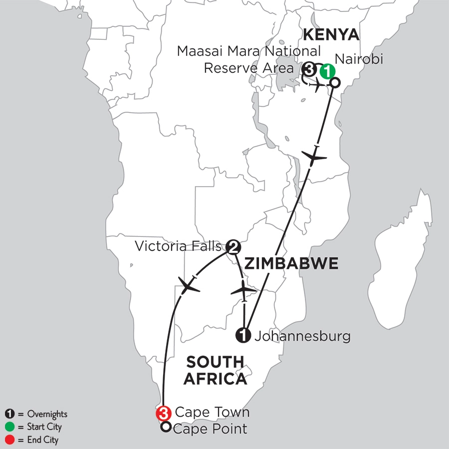 Africa is home to some of the world’s most marvelous sites, most endangered species, and most incredible people. And it’s time for YOU to experience it all! We coordinate the details for you—from hotels and transportation, to sightseeing and most meals, Monograms makes it easy to help you hit Africa’s biggest highlights.Your African safari starts when you arrive in Nairobi. We can pick you up at the airport and help you manage the hassle of getting to your hotel. The next day, after an included breakfast, adventure off on your first game drive at Maasai Mara National Reserve – the most famous game area in Kenya. This reserve has a strong permanent population of wildlife, so stay on the lookout for the “Big 5” – lion, leopard, elephant, rhino, and Cape buffalo. You will spend two full days at this reserve. Next, fly south for a quick stop in South Africa’s capital city of Johannesburg before heading to Zimbabwe. A trip to Africa wouldn’t be complete without experiencing Victoria Falls. We’ve arranged for you to have a private, guided walk of the mighty falls and a sunset cruise on the Zambezi River, where you’ll have an opportunity to take photographs of the wildlife and sip on a drink as you watch a spectacular African sunset—the perfect ending to a day of discovery! Finally, fly into beautiful Cape Town where your Local Host® will take you on a private tour of the city’s highlights. Ascend to the top of Table Mountain, visit the penguins at Boulders Beach, and stop at the Cape of Good Hope – the southernmost point on the African continent. The following day is free to explore on your own or you can join an optional excursion. Consider a visit to the beautiful Cape winelands for a magical day winery visits and tastings. From June to December you can also choose to go whale-watching in Hermanus, the self-proclaimed whale-watching capital of the world.With Monograms, your dream vacation to Africa doesn’t feel so far out of reach. With all of the details arranged for you, all you have to do is pack your bags and prepare for this once-in-a-lifetime experience!