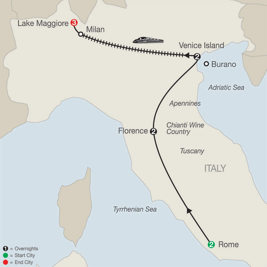 ROME A special welcome dinner at a local restaurant; guided sightseeing, visit the Colosseum and Roman Forum, the Vatican Museums and Sistine Chapel, St. Peter’s Square and BasilicaFLORENCE Guided walking tour, visit Michelangelo’s David and Signoria Square; [LF] a special dinner at Finisterrae restaurantVENICE Private boat ride, guided walking tour, visit St. Mark’s Square and Basilica, Doges’ Palace and the Bridge of Sighs; glassblower demonstration with exclusive gift; [LF] farewell drink at Caffé FlorianVENICE ISLAND-LAKE MAGGIOREby high-speed Eurostar TrainLAKE MAGGIOREGuided sightseeing and boat ride to Isola Bella to visit the baroque palace and peacock gardensHeadsets throughout the tour