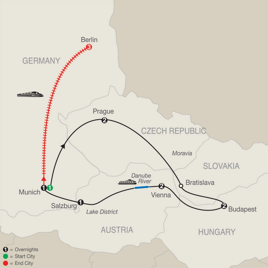 MUNICH Welcome dinner; orientation including Marienplatz; farewell dinnerPRAGUE Guided sightseeing, Astronomical Clock, visit the Hradcany Castle groundsBRATISLAVA [LF] Visit the capital of Slovakia and enjoy a special lunch at a local restaurantBUDAPEST Guided sightseeing, a panoramic view from Fishermen’s Bastion, visit Matthias Coronation ChurchVIENNA Guided sightseeing, visit St. Stephen’s CathedralDANUBE CRUISE [LF] (Departures April 12-October 4) Enjoy Kaffee und Kuchen (coffee and cake) on boardSALZBURG Guided sightseeing, visit Mirabell Gardens and St. Peter’s Churchyard; [LF] taste the traditional Mozartkugel and Doppler Konfekt; a special dinner with wine at a local restaurantMUNICH-BERLIN By high-speed TrainBERLIN Guided sightseeing of historic landmarks. Take pictures of Holocaust Memorial & Brandenburg GateHeadsets throughout the tour