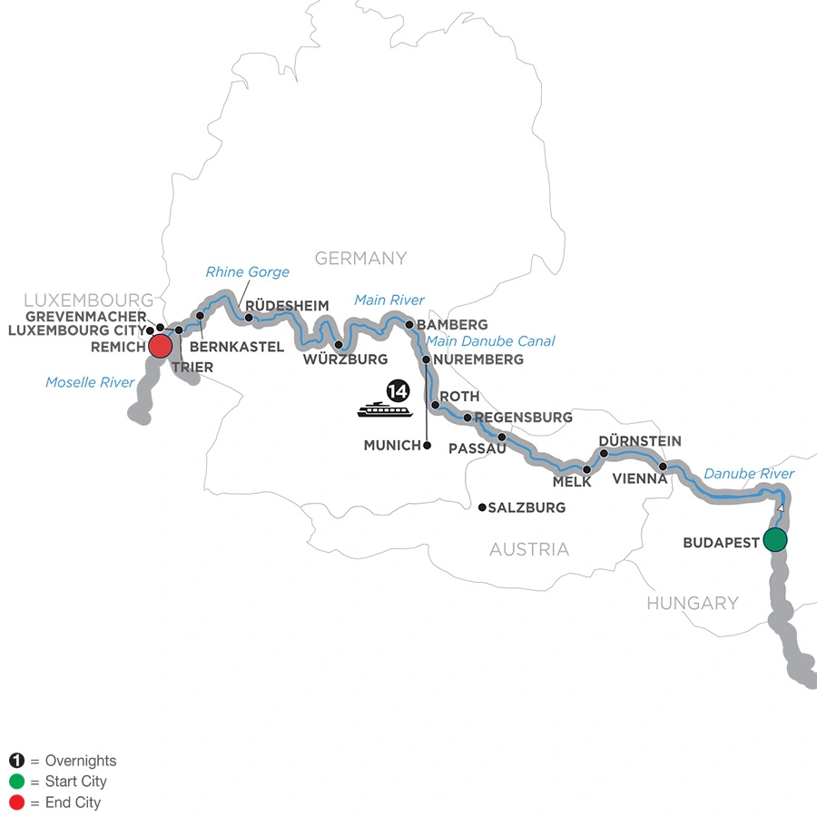 On this Europe river cruise vacation, you’ll sail along the Danube, Main, Rhine, and Moselle Rivers. Board your ship in vibrant Budapest, Hungary, then see some of the most intriguing cities of Austria and Germany, before ending your cruise in Luxembourg. On the first portion of your cruise, from Budapest to Nuremberg, also discover the European Jewish Heritage through dedicated sightseeing in Vienna and Regensburg, and an onboard lecture about Jewish culture and history.Sail out of Budapest, past the impressive Parliament Building on the Danube River, to Austria’s elegant capital of Vienna. There’s a guided walk in the quaint village of Dürnstein, in the heart of the Wachau Valley, and a visit to the magnificent Benedictine Abbey of Melk. You’ll be introduced to the treasures of Passau, Regensburg, and Nuremberg, and take an excursion to Bavaria’s capital, Munich. On the banks of the Main River, you’ll find small towns tucked away behind defensive walls and towered gates. These picturesque Bavarian villages are a photographer’s dream. Visit Würzburg and the impressive Bishop’s Residenz, then sail into the Rhine River and stop in Rüdesheim—a quintessential Rhine Valley town. Later, cruise the wide, peaceful curves of the Moselle River Valley, famous for its picturesque scenery, and arrive in the wine village of Bernkastel surrounded by Germany’s largest expanse of vineyards. Before you leave, we’ll introduce you to some of the famed Moselle wines. In Trier, Germany, believed to be even older than Rome—having been populated over a thousand years before the Romans arrived—a Local Guide will show you the sights, including the Porta Nigra, the only surviving fortified gate from the original Roman settlement. Disembark in Luxembourg and take home many happy memories of this fascinating European river cruise!