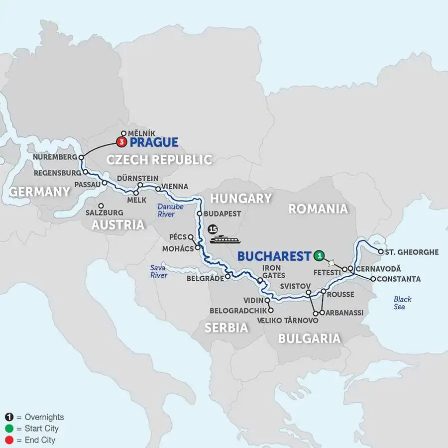 Day 1 Bucharest: welcome to BurcharestDay 2 Bucharest–Fetesti (Embarkation): guided sightseeing in Bucharest; onboard welcome receptionDay 3 St. Gheorghe: excursion to Danube Delta; Km 0 celebration; onboard lectureDay 4 Cernavodă: excursion to Constanta; guided sightseeing, visit the National History & Archaeological MuseumDay 5 Rousse. Excursion to Veliko Târnovo & Arbanassi: guided sightseeing, visit Tsarevets Fortress in Veliko Târnovo, and the Ethnographical Museum and Church of the Nativity in Arbanassi; or guided sightseeing of RousseDay 6 Vidin–Belogradchik: guided sightseeing to Vidin’s fortress; excursion to Belogradchik to see the rock formationsDay 7 Iron Gates: cruise through the Iron Gates gorge; visit Lepenski Vir archaeological exhibitionDay 8 Belgrade: guided sightseeingDay 9 Mohács: excursion to Pécs, organ concertDay 10 Budapest: guided sightseeing, see Fishermen’s BastionDay 11 Budapest–Vienna: cruising; onboard wine tasting and lecture by our Master of WineDay 12 Vienna: guided sightseeing; onboard Food and Wine pairing dinner Day 13 Dürnstein–Melk: guided walk in Dürnstein, see the Stiftskirche; guided visit of the Benedictine Abbey; wine tastingDay 14 Passau: guided walkDay 15 Regensburg: guided walk; enjoy a snack at the Historische WurstkücheDay 16 Nuremberg: choice of guided sightseeing or Nuremberg Rally Grounds tourDay 17 Nuremberg (Disembarkation)–Prague: travel to PragueDays 18-19 Prague: guided sightseeing, see the Astronomical Clock and visit Hradčany Castle grounds; excursion to Melnik; free timeDay 20 Prague: your vacation ends this morning